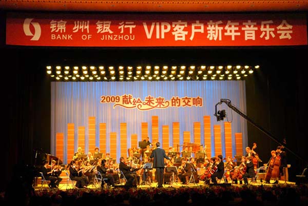 12月23日晚,锦州银行在文化宫举办了“2009-献给未来的交响”为主题的新年音乐会,董事长行长张伟等有关领导和锦州银行的VIP客户出席现场。